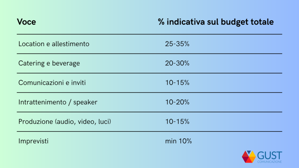 Uno degli errori più comuni nell'organizzazione di eventi aziendali è affrontare il budget in modo residuale — si decide "cosa fare" e poi si cerca di capire quanto costa. Funziona molto meglio al contrario: definisci il budget totale disponibile prima di qualsiasi altra decisione operativa, e suddividilo per macro-aree: